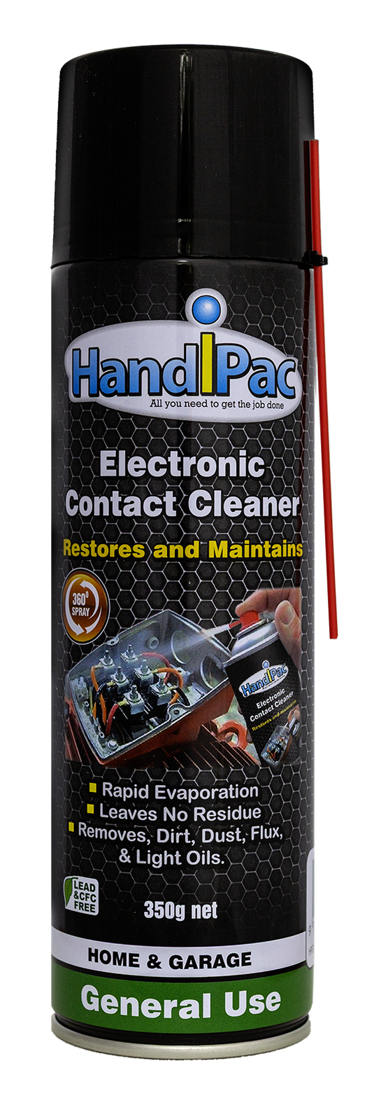 HandIPac Electronic Contact Cleaner quickly removes greases, dust, fluxes and oxidation. It restores and maintains precision and efficiency on  Circuitry systems, Relay contacts, Distributors,  Signal systems, Transistors and Switches.